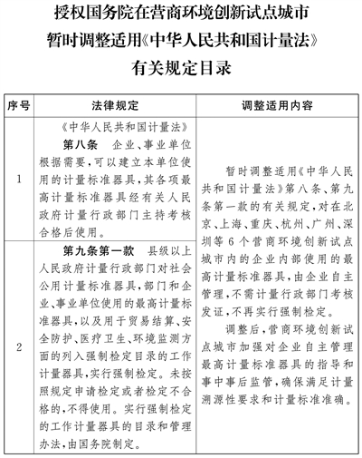 为进一步转变政府职能,优化营商环境,激发市场活力,第十三届全国人民代表大会常务委员会第三十一次会议决定:授权国务院暂时调整适用《中华人民共和国计量法》的有关规定(目录见图),在北京、上海、重庆、杭州、广州、深圳等6个营商环境创新试点城市试行。暂时调整适用的期限为三年,自本决定施行之日起算。国务院应当加强对试点工作的指导、协调和监督,及时总结试点工作经验,并就暂时调整适用有关法律规定的情况向全国人民代表大会常务委员会作出报告。对实践证明可行的,修改完善有关法律;对实践证明不宜调整的,恢复施行有关法律规定。
